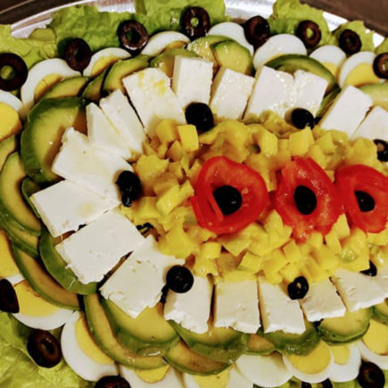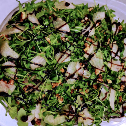 Składniki: 2 pęczki sałaty rukoli 1 średniej wielkości gruszka 10  orzechów włoskich 2 łyżki  rodzynek Krem  z octu balsamicznego Przygotowanie: Składniki, oczyścić, umyć i osuszyć. Gruszkę obrać ze skórki. Rozłożyć na półmisku 1/3 objętości rukoli, a następnie posypać rozkruszonymi orzechami i rodzynkami. Pokroić gruszkę w cienkie plastry o szerokości 1/3 średnicy gruszki (mogą być  nieforemne) …