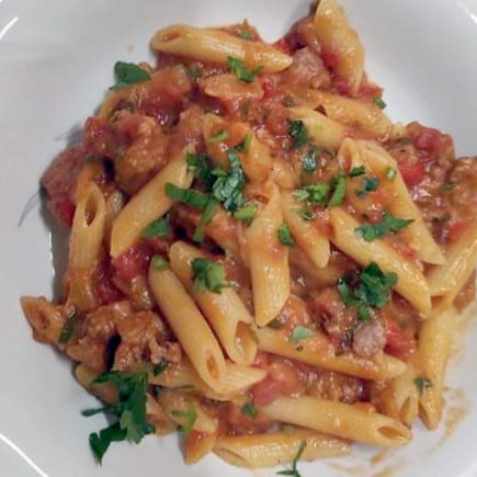 Składniki:  makaron 300 g (nie gładki) 1 bakłażan 1 cebula pokrojona w małą kostkę 3 łyżki oliwy z oliwek 100g surowej kiełbasy 1/2szklanki białego wytrawnego wina 1 papryka czerwona 1 papryczka ostra świeża lub dobra szczypta peperoncino 0,5 l przecieru pomidorowego 1 ząbek czosnku, sól i pieprz do smaku pietruszka zielona pokrojoną 2lyżki 4 lyżki startego sera parmezanu Przygotowanie: Oczyścić, …