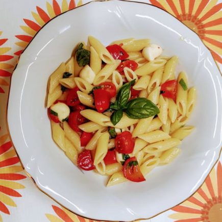 Składniki: 300 g makaronu rigatoni – rurki 6 – 8 pomidorów czereśniowych / małych/ 10 małych mocarelek lub 1 mocarele większą pokrojona w kostkę 1 łyżka posiekanej świeżej pietruszki 5- 8 zielonych listków bazylii porwanych (nie kroić nożem ponieważ bazylia zmieni kolor) sól 1/2 łyżeczki peperoncino oliwa z oliwek okolo 3 – 4łyżki. Przygotowanie. Pomidory …