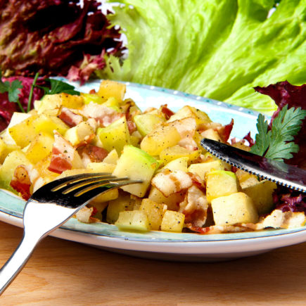Składniki 600 g rzepy 3 plastry wędzonego boczku oliwa z oliwek sól pieprz Sposób przygotowania Oczyszczoną i umytą rzepę pokroić w kostkę i gotować około 7 minut w osolonej wodzie. Na rozgrzanej oliwie podsmażyć drobno pokrojony boczek i dodać odcedzoną rzepę. Smażyć razem około 2 minuty, posolić i doprawić pieprzem. Podawać natychmiast po usmażeniu.