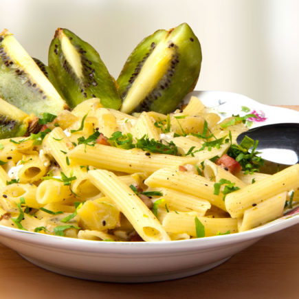 Składniki 300 g rigatoni (rurki ścięte prosto) 150 g wędzonego boczku 1 cebula 1⁄2 szklanki śmietany (nie gęstej) 40 g sera ricotta 2 owoce kiwi (można je zastąpić 2 gruszkami lub 4 plastrami ananasa) świeże lub suszone zioła do smaku: oregano, bazylia, tymianek, szałwia natka pietruszki 50 g masła 1⁄2 szklanki wody oliwa z oliwek 40 g startego parmezanu …